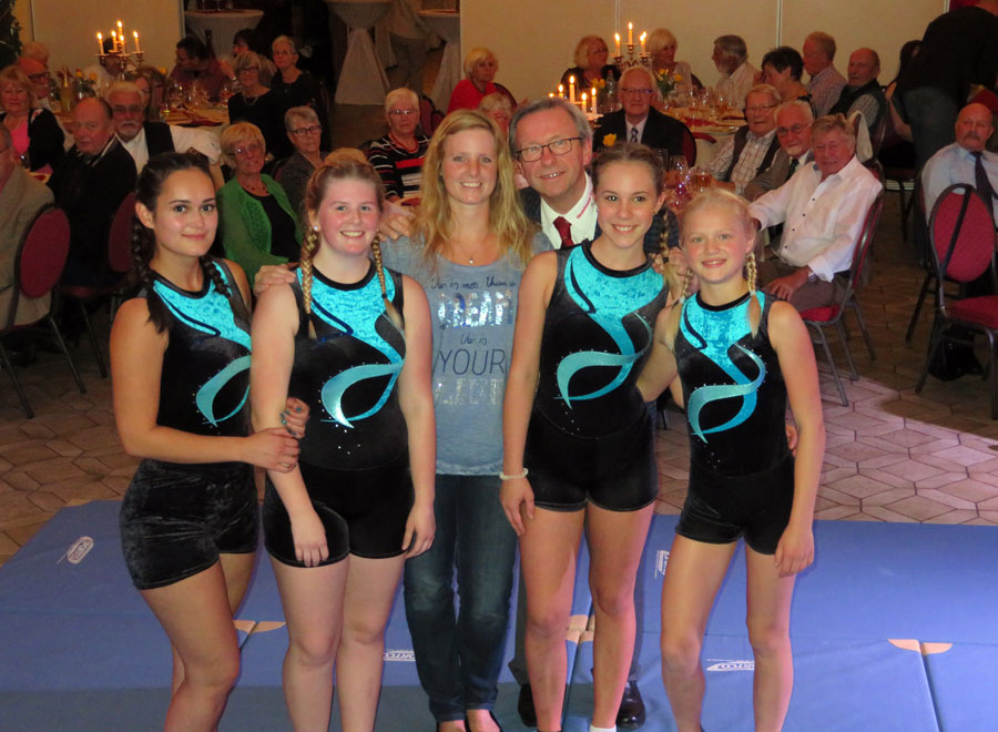 Die Turnmädchen Verona, Michelle, Cara und Merle zusammen mit der Trainerin und Jugendwartin Nicole Düssel und dem Vorsitzenden Hermann Wehlmann.