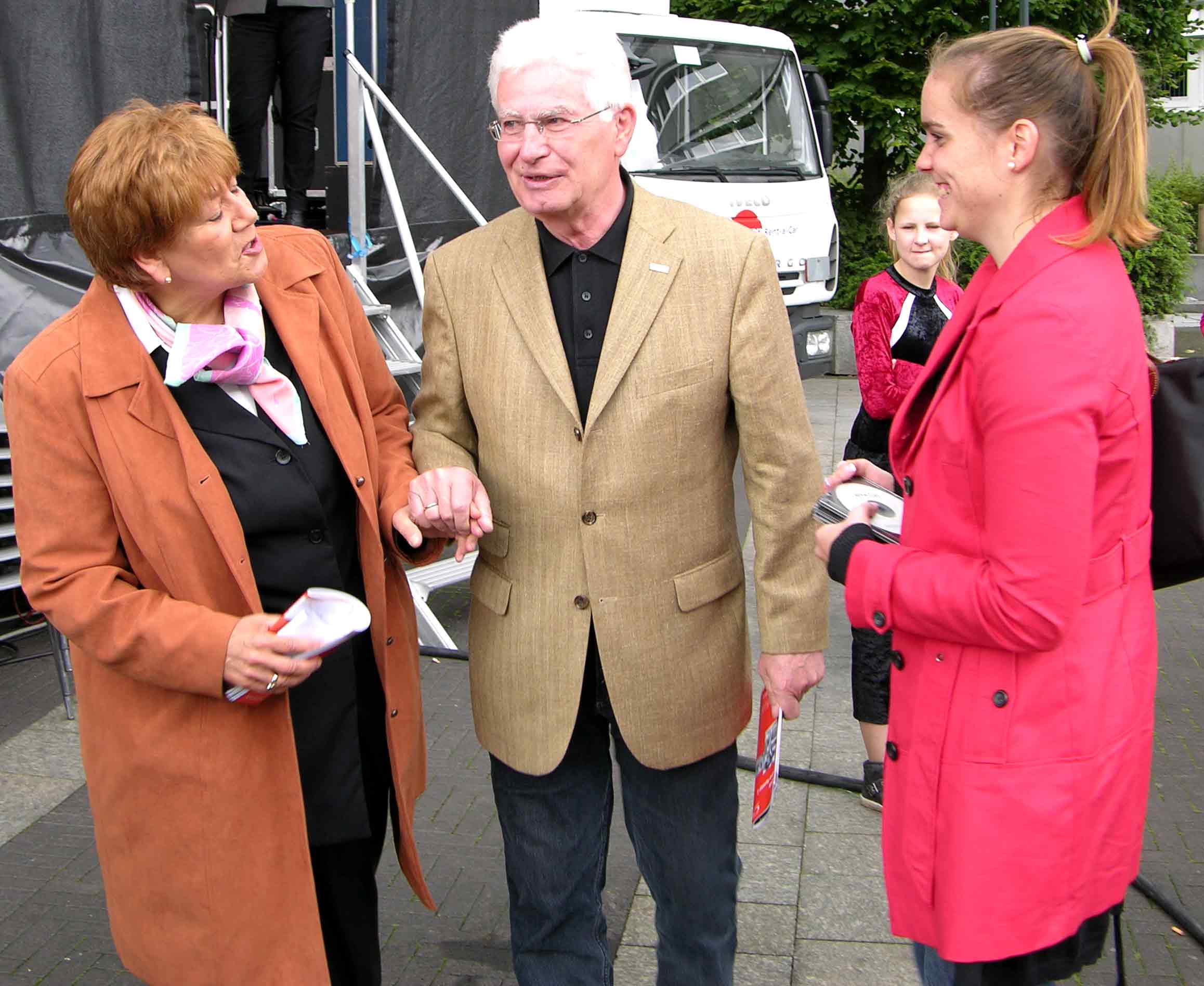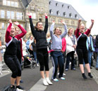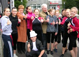 "Daumen hoch" für gutes Wetter, gute Stimmung und gute Leistung: Aktive des NTV auf dem Theodor-Heuss-Platz in Remscheid zusammen mit der Oberbürgermeisterin der Stadt Remscheid, Frau Beate Wilding, und dem Präsidenten des Westfälischen Turnerbundes WTB, Herrn Michael Buschmeyer.